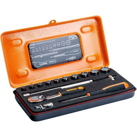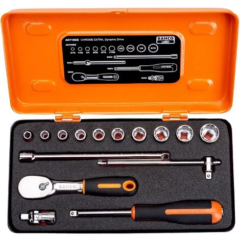 Coffret de douilles en pouces Bahco A6716DZ avec cliquet réversible 1/4, 10 douilles 12 pans en pouces 3/16, 7/32, 1/4, 9/32, 5/16, 11/32, 3/8, 7/16, 1/2 et 9/16. Poignée coulissante en T 1/4, tournevis 1/4, rallonges 1/4 150 mm, cardan universel 1/4. Finition polie, acier en alliage haute performance, réduction de l’usure de la fixation des douilles, poignée bi-matière anti-glisse. Différents modèles de cliquets Américain disponibles en stock en 6 et 12 pans. Respecte les normes ISO 1174 et DIN 3120. Outillage professionnel garanti à vie.