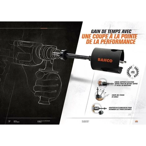 Cette scie trépan au carbure Bahco 3833 s’adapte à toutes les perceuses électriques à colonne et portables. L’ensemble comprend la scie trépan et l’arbre support pour la scie Bahco 3834-ARBR-930EL. Elle s’utilise sur la plupart des matériaux tels que le bois, le MDF, le plâtre, le placage, le plastique et la brique. La scie trépan Bahco 3833 Multi-Construction permet également la coupe en angle. Elle offre une grande profondeur de coupe de 71mm et reçoit des larges fentes d’évacuation pour éliminer rapidement les matériaux. Tailles disponibles de 19 à 159 mm de diamètre, dimension du trou jusqu’à + 1.5mm maximum par rapport au diamètre de la scie.