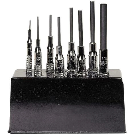 Jeu de chasse-goupilles dans un support en plastique, 8 pièces. Modèle : nickelé et chromé. Matière : vanadium extra. Fine pointe rectifiée et polie. La pointe de la douille de guidage. Lors de la pointe de frappe en raison de la prise mobile prend en charge afin d’éviter un annuler. 6,0 mm sans douille de guidage. Ce texte a été traduit par une machine.