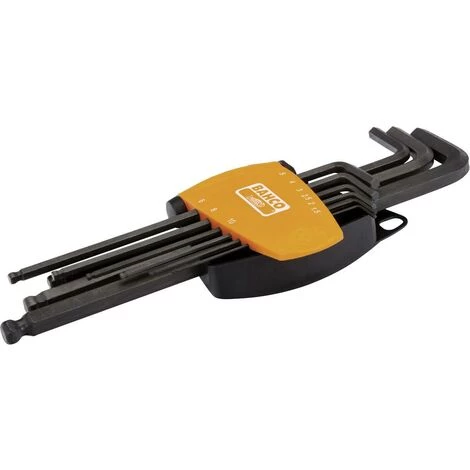 Jeu de tournevis coudés, version longue, tête à rotule, bruni, 9 pièces, métrique. Support compact à 2 composants permet de sortir de chaque clé. Marquage des tailles de clés sur support pour une utilisation simple et rapide. Oeillet de suspension.