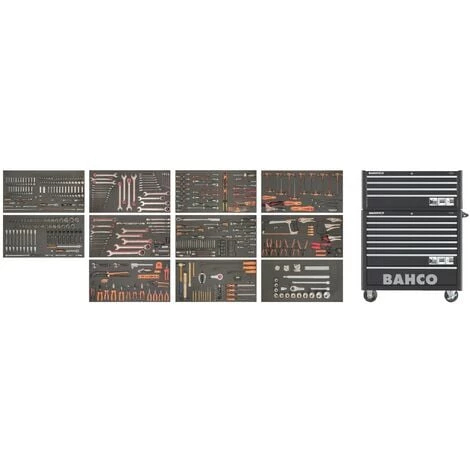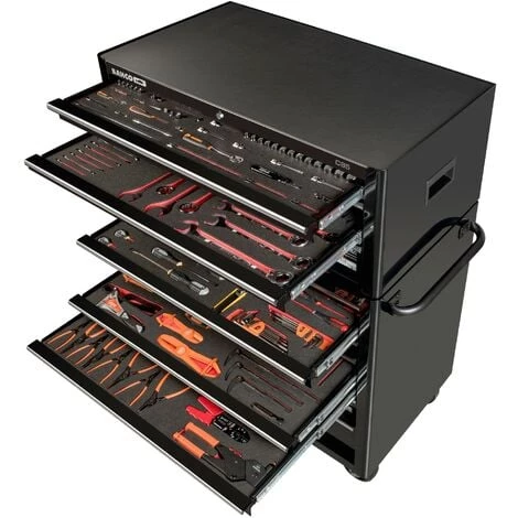 - Servante d’atelier usage intensif 40″ C75 8 tiroirs + coffre E85 4 tiroirs + composition d’outils.