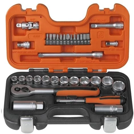Coffret de 34 pièces Bahco S330 avec cliquet 3/8. Cliquet et douilles en alliage d’acier à hautes performances permettant une résistante élevée à la rupture et à l’usure. Comprend : – 12 douilles 6 pans 3/8 10, 11, 12, 13, 14, 15, 16, 17, 18, 19, 20, 22 mm. – 1 cliquet réversible 3/8, 60 dents, angle de débattement 6°, bouton pression pour dégagement rapide. – 2 rallonges 3/8 3/75 mm et 6/150 mm. – 1 cardan universel 3/8. – 1 porte embout 3/8 x 1/4. – 2 douilles 3/8 pour cliquet bougies 6 pans 16 mm (5/8), 21 mm (13/16). – 1 rallonge avec manche 1/4. – 1 porte embout 1/4 x 1/4. – 3 embouts 1/4 pour vis à fente 4, 5.5, 7 mm. – 4 embouts 1/4 pour vis Phillips PH 1, 2, 3, 4 – 6 embouts 1/4 pour vis 6 pans 3, 4, 5, 6, 7, 8 mm – Coffret en polythène haute densité Normes ISO 1174 et DIN 3120Outillage garanti à vie Bahco.
