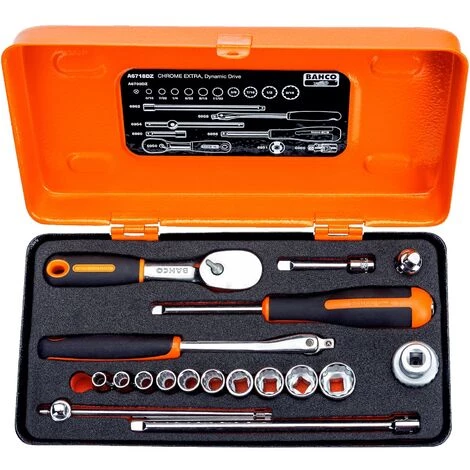 Ce coffret de douilles Bahco A6718DZ est composé de 18 pièces : 1 cliquet réversible 1/4″, 1 adaptateur de cliquet 1/4″, 1 poignée coulissante en T 1/4″, 1 rallonge avec manche 1/4″, 1 poignée articulée 1/4″, 1 rallonge 1/4″ (50 mm), 1 cardan universel 1/4″, 1 rallonge 1/4″ (150 mm), douille 12 pans 1/4″, dimensions en pouces, 3/16, 7/32, 1/4, 9/32, 5/16, 11/32, 3/8, 7/16, 1/2, 9/16″. Coffret métallique, normes ISO 1174 et DIN 3120.