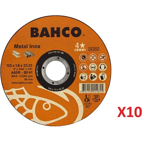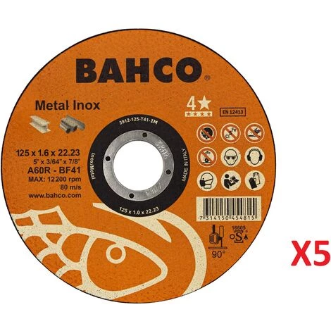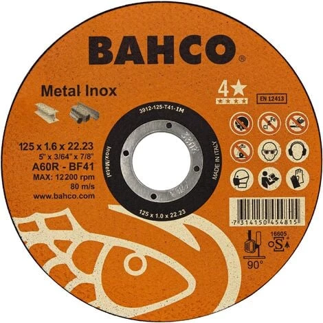 Disque à tronçonner pour acier inoxydable et métal Bahco 3911-125-T41-IM pour outillage électroportatif. Diamètre 125mm, épaisseur 1,6mm et alésage 22.23mm. Disque haute performance pour couper l’acier inoxydable avec précision et une formation minimale de bavures. Le temps de coupe est optimal et la durée de vie prolongée, faible vibration pour une stabilité accrue. Composition sans ferrite, ni souffre, ni chlore. Certification OSA, conforme à la norme EN12413. Disponible également en lot de 5, 10 et 25 et à l’unité. Qualité 5 étoiles. Nombreux modèles de disques Bahco disponibles en stock