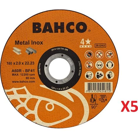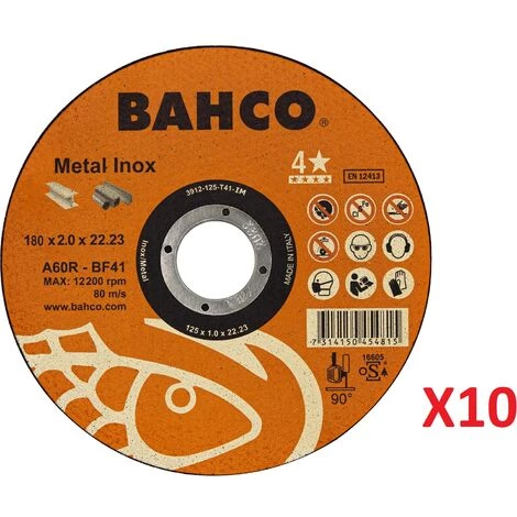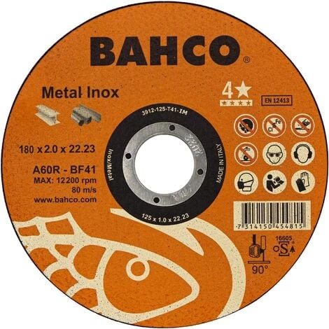 Disque à tronçonner pour acier inoxydable et métal Bahco 3911-180-T41-IM pour outillage électroportatif. Diamètre 180mm, épaisseur 2mm et alésage 22.23mm. Disque haute performance pour couper l’acier inoxydable avec précision et une formation minimale de bavures. Le temps de coupe est optimal et la durée de vie prolongée, faible vibration pour une stabilité accrue. Composition sans ferrite, ni souffre, ni chlore. Certification OSA, conforme à la norme EN12413. Disponible également en lot de 5, 10 et 25 et à l’unité. Qualité 5 étoiles. Nombreux modèles de disques Bahco disponibles en stock