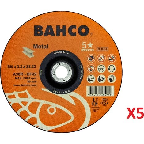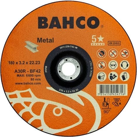 Disques à tronçonner pour métal Bahco 3911-180-T42-M pour outillage électroportatif. Diamètre 180mm, épaisseur 3,2mm et alésage 22.23mm. Disque haute performance pour couper l’acier inoxydable avec précision et une formation minimale de bavures. Le temps de coupe est optimal et la durée de vie prolongée, faible vibration pour une stabilité accrue. Composition sans ferrite, ni souffre, ni chlore. Certification OSA, conforme à la norme EN12413. Disponible en lot de 5, 10, 25 et à l’unité. Nombreux modèles de disques Bahco disponibles en stock