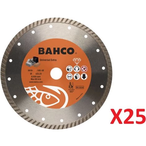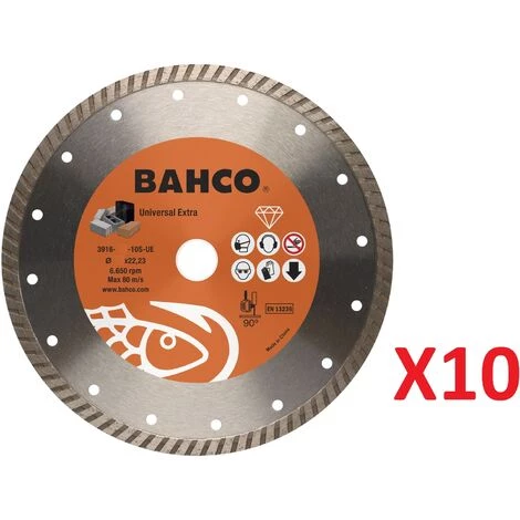 Disque diamant utilisation universelle Bahco 3916-150-10S-UE pour outillage électroportatif. Idéal pour couper le béton le béton, pierres ou tuiles. Diamètre 150mm, épaisseur du trait de coupe 3mm (bord du disque), épaisseur de la jante continue fritée diamantée (centre du disque) 10mm et alésage 22.23mm. Diamants fixes au noyau d’acier par haute pression et température élevée. Coupes humides et à sec. Conforme à la norme EN13236. Qualité extra universelle. Disponible à l’unité, en lot de 5, 10, 25 et 50.