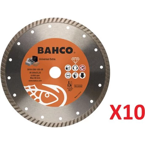 Disque diamant utilisation universelle Bahco 3916-230-10S-UE pour outillage électroportatif. Idéal pour couper le béton le béton, pierres ou tuiles. Diamètre 230mm, épaisseur du trait de coupe 3,5mm (bord du disque), épaisseur de la jante continue fritée diamantée (centre du disque) 10mm et alésage 22.23mm. Diamants fixes au noyau d’acier par haute pression et température élevée. Coupes humides et à sec. Conforme à la norme EN13236. Qualité extra universelle. Disponible à l’unité, en lot de 5, 10, 25 et 50.