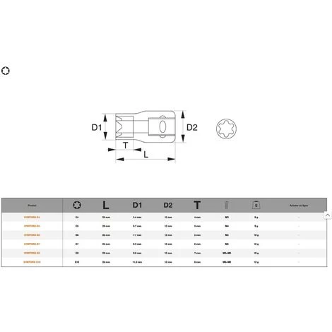 Douille Bahco 6700TORX avec fixation carré de 1/4 et empreinte femelle TORX® Cette douille bénéficie d’un corps cranté pour approcher le serrage et le desserrage à la main de vos vis, elle est incompatible avec les outils motorisés (visseuse…) mais compatible avec tous les outils à main à embout carré de 1/4 (Tournevis, cliquet, bras de force…).Plusieurs tailles disponibles en stock. Conçu dans un alliage d’acier haute performance avec une finition polie elle est parfaite pour les utilisations intensives (professionnel ou bricoleur exigeant). Normes de fabrication ISO 2725/1174 et DIN 3124/3120.