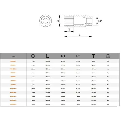 Douille longue métrique Bahco A6800DM avec fixation carré de 1/4 et empreinte femelle 12 pans. Longueur totale 50,6mm. Paroi fine et réduction de l’usure grâce au profil » Dynamic Drive TM « . Cette douille bénéficie d’un corps cranté pour approcher le serrage et le desserrage à la main de vos vis, elle est incompatible avec les outils motorisés (visseuse…) mais compatible avec tous les outils à main à embout carré de 1/4 (Tournevis, cliquet, bras de force…). Conçu dans un alliage d’acier haute performance avec une finition polie elle est parfaite pour les utilisations intensives (professionnel ou bricoleur exigeant). Disponibles du 4 au 14mm. Normes ISO 2725-1/1174-1 et DIN 3120