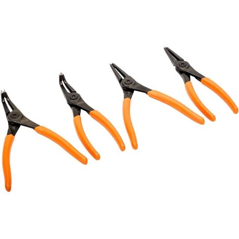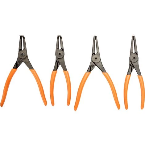 Ce jeu de 4 pinces à circlips Bahco 28-29/S4 est composé d’une pince à circlips intérieurs à bec droit 2800-180 : longueur 180mm et diamètre des circlips 19 à 60mm ; une pince à circlips intérieurs à bec courbé à 90° 2890-180 : longueur 180mm et diamètre des circlips 19 à 60mm ; d’une pince à circlips extérieurs à bec droit 2900-180 : longueur 180mm et diamètre des circlips 19 à 60mm et d’une pince à circlips extérieurs à bec courbé à 90° 2990-180 : longueur 180mm et diamètre des circlips 19 à 60mm. Nombreux modèles de pinces Bahco disponibles en stock.