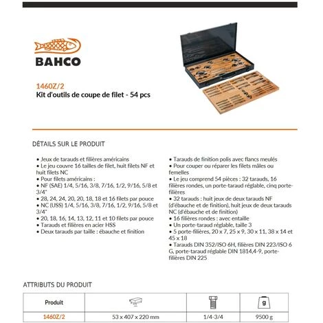 Ce kit d’outils de coupe de filet Bahco 1460Z/2 est composé de 54 pièces. Il comprend 32 tarauds (32 tarauds : huit jeux de deux tarauds NF (d’ébauche et de finition), huit jeux de deux tarauds NC (d’ébauche et de finition), 16 filières rondes (avec entaille), un porte-taraud (réglable, taille 3) et 5 porte-filières(20 x 7, 25 x 9, 30 x 11, 38 x 14 et 45 x 18). Spécialement conçu pour couper et réparer les filets mâles ou femelles. Tarauds de finition polis avec flancs meulés. Le jeu couvre 16 tailles de filet, 8 filets NF et 8 filets NC. Pour les filets américains : NF (SAE) 1/4, 5/16, 3/8, 7/16, 1/2, 9/16, 5/8 et 3/4, 28, 24, 24, 20, 20, 18, 18 et 16 filets par pouce, NC (USS) 1/4, 5/16, 3/8, 7/16, 1/2, 9/16, 5/8 et 3/4, 20, 18, 16, 14, 13, 12, 11 et 10 filets par pouce. Deux tarauds par taille : ébauche et finition. Tarauds DIN 352/ISO 6H, filières DIN 223/ISO 6 G, porte-taraud réglable DIN 1814,4-9, porte-filières DIN 225. Tarauds et filières en acier HSS.