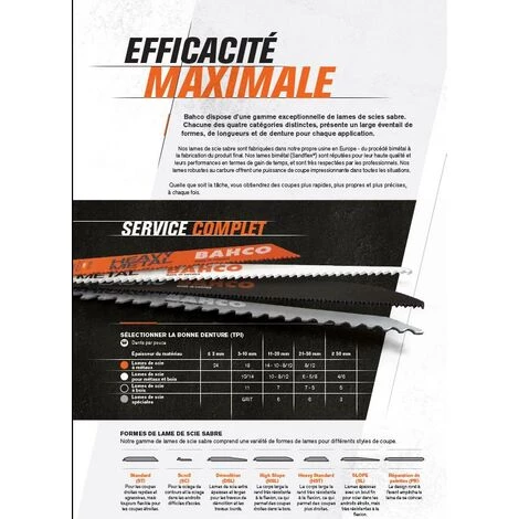 La lame de scie sabre Bahco3940-300-6-SL est une lame avec une forme spécifique (Slope) avec nez de coupe pointu, elle est capable de travailler dans le bois épais (même avec pointe) ou dans le métal épais. Sa forme est particulièrement adaptée pour les coupes pleines ou difficiles d’accès grâce à sa pointe de coupe. La conception Bimétal Sandflex rend la lame pratiquement incassable, souple et rigide à la fois la lame suit parfaitement vos mouvements. Longueur de lame 300mm, 6 dents par pouce (25.4mm), épaisseur 1.3mm La lame de scie sabre Bahco3940-300-6-SL est disponible à l’unité, en lot de 2, de 5 ou de 10 pièces.