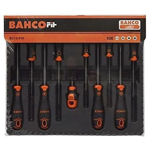 Jeu de tournevis BahcoFit 10 pi�ces.Utilisation confortable gr�ce � la poign�e � 2 composants compos�e de plus de 75 % de caoutchouc.Adh�rence maximale gr�ce aux rainures antid�rapantes verticales sur la poign�e.Identification facile de la taille et du type gr�ce aux marquages sur la poign�e. Alliage d’acier isolant haute performance avec pointe noire.Trou de suspension int�gr�.Pour travailler sur des �quipements avec une alimentation �lectrique jusqu’� 1000 V.BahcoFit set, 10 PcsSL, PH, PZ, RobertsonEn plateau thermoform� Tournevis isol�s plats, droits, PZ , Robertson et Ph